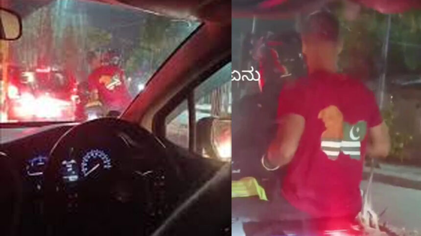 ಬೆಂಗಳೂರು: ಸಿಲಿಕಾನ್ ಸಿಟಿ ಬೆಂಗಳೂರಿನಲ್ಲಿ ಬೈಕ್ ಸವಾರನೊಬ್ಬ ಕಾಶ್ಮೀರ ಮ್ಯಾಪ್ ನಲ್ಲಿ ಪಾಕ್ ಬಾವುಟಮುದ್ರಿತವಾಗಿರುವ ಟೀ ಶರ್ಟ್ ಧರಿಸಿರುವ ವೀಡಿಯೋ ಸೋಷಿಯಲ್ ಮೀಡಿಯಾದಲ್ಲಿ ಸಿಕ್ಕಾಪಟ್ಟೆ ವೈರಲ್ ಆಗುತ್ತಿದೆ.
