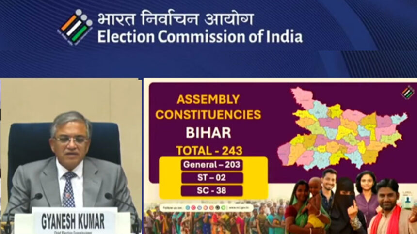 ನವದೆಹಲಿ,ಅ.06 : ಮಹತ್ವದ ಬೆಳವಣಿಗೆಯೊಂದರಲ್ಲಿ, ಕೇಂದ್ರ ಚುನಾವಣಾ ಆಯೋಗವು ಬಿಹಾರ ವಿಧಾನಸಭೆ ಚುನಾವಣೆ (Bihar Assembly Election)ಗೆ ದಿನಾಂಕ ಘೋಷಣೆ ಮಾಡಿದೆ. 6 ನವೆಂಬರ್‌ ರಿಂದ 11 ನವೆಂಬರ್‌ವರೆಗೆ ಎರಡು ಹಂತದಲ್ಲಿ ಮತದಾನ ಪ್ರಕ್ರಿಯೆ ನಡೆಯಲಿದ್ದು, ನವೆಂಬರ್‌ 14ರಂದು ಫಲಿತಾಂಶ ಘೋಷಣೆಯಾಗಲಿದೆ. ಈಗಾಗಲೇ SIR ಪ್ರಕ್ರಿಯೆ ಕಾರಣಕ್ಕೆ ವಿವಾದದ ಕೇಂದ್ರಬಿಂದುವಾಗಿರುವ ಬಿಹಾರ ವಿಧಾನಸಭೆ ಚುನಾವಣೆ, ಈಗ ಮತದಾನ ದಿನಾಂಕ ಘೋಷಣೆಯಿಂದಾಗಿ ಮತ್ತಷ್ಟು ಚುರುಕುಗೊಂಡಿದೆ.