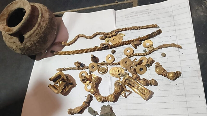 ಗದಗ, ಜನವರಿ 11: ಮನೆ ಕಟ್ಟಲು ಅಡಿಪಾಯ ತೆಗೆಯುವ ಸಂದರ್ಭದಲ್ಲಿ ನೆಲದೊಳಗೆ ಚಿನ್ನಾಭರಣಗಳಿರುವ ನಿಧಿ ಪತ್ತೆಯಾಗಿರುವ ಅಪರೂಪದ ಘಟನೆ ಗದಗ ಜಿಲ್ಲೆಯ ಲಕ್ಕುಂಡಿ ಗ್ರಾಮದಲ್ಲಿ ನಡೆದಿದೆ.