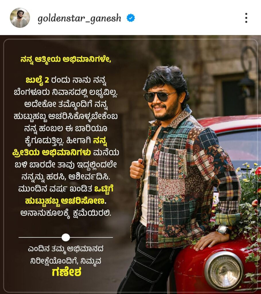 ಕೊರೋನಾ ಹಾಗೂ ತಂದೆಯ ನಿಧನದಿಂದ ನಾಲ್ಕು ವರ್ಷಗಳಿಂದ ಬರ್ತ್ ಡೇ ಸೆಲೆಬ್ರೇಷನ್ ಗೆ ಬ್ರೇಕ್ ಗಣೇಶ್ ಬ್ರೇಕ್ ಹಾಕಿದ್ದರು. ಆದರಂತೆ ಈ ಬಾರಿಯೂ ನಾನು ಊರಲ್ಲಿ ಇಲ್ಲ. ಮುಂದಿನ ವರ್ಷ ಸಂಭ್ರಮಿಸೋಣ ಎಂದು ಮನವಿ ಮಾಡಿದ್ದಾರೆ.