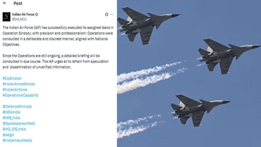 “ಭಾರತೀಯ ವಾಯುಪಡೆ ಆಪರೇಷನ್ ಸಿಂಧೂರ್ ಅಡಿಯಲ್ಲಿ ನಿಯೋಜಿಸಿದ್ದ ಎಲ್ಲಾ ಕಾರ್ಯಗಳನ್ನು ನಿಖರವಾಗಿ ಮತ್ತು ವೃತ್ತಿಪರತೆಯೊಂದಿಗೆ ಯಶಸ್ವಿಯಾಗಿ ಮಾಡಿ ಮುಗಿಸಿದೆ. ಈ ಎಲ್ಲಾ ಕಾರ್ಯಚರಣೆಗಳು ಉದ್ದೇಶಪೂರ್ವಕವಾಗಿ ಮತ್ತು ವಿವೇಚನೆಯಿಂದ ರಾಷ್ಟ್ರದ ಹಿತಾಸಕ್ತಿಗೆ ಅನುಗುಣವಾಗಿ ಮಾಡಿ ಮುಗಿಸಿದ್ದೇವೆ” ಎಂದು ಹೇಳಿದೆ.