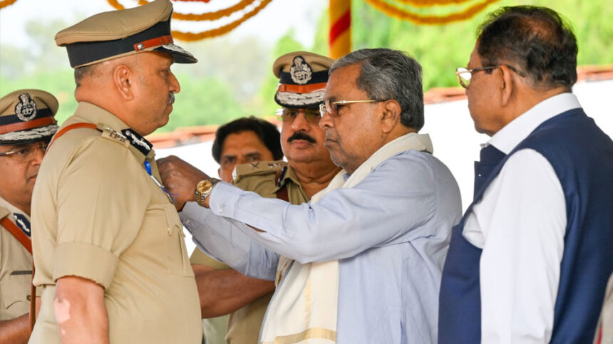 ಪೊಲೀಸ್ ಧ್ವಜ ದಿನಾಚರಣೆಯಾಗಿರುವ ಇಂದು ದಕ್ಷತೆ, ನಿಷ್ಠೆ ಮತ್ತು ನಿಸ್ವಾರ್ಥ ಮನೋಭಾವದಿಂದ ಸೇವೆ ಸಲ್ಲಿಸಿರುವ ಪೊಲೀಸ್ ಅಧಿಕಾರಿಗಳಿಗೆ ಮುಖ್ಯಮಂತ್ರಿಗಳ ಚಿನ್ನದ ಪದಕ ಪುರಸ್ಕಾರ ನೀಡಿ ಸನ್ಮಾನಿಸಲಾಯಿತು. ಮುಖ್ಯಮಂತ್ರಿ ಸಿದ್ದರಾಮಯ್ಯನವರು ಪುರಸ್ಕಾರಕ್ಕೆ ಆಯ್ಕೆಯಾದ ಪೊಲೀಸ್ ಅಧಿಕಾರಿಗಳಿಗೆ ಪದಕ ನೀಡಿ ಗೌರವಿಸಿದರು. ಅಧಿಕಾರಿಗಳು ಪೊಲೀಸ್ ಶಿಸ್ತಿನೊಂದಿಗೆ ಮುಖ್ಯಮಂತ್ರಿ ಸಿದ್ದರಾಮಯ್ಯನವರಿಗೆ ಪೊಲೀಸ್ ಸೆಲ್ಯೂಟ್ ಗೌರವ ಸಲ್ಲಿಸಿದರು.