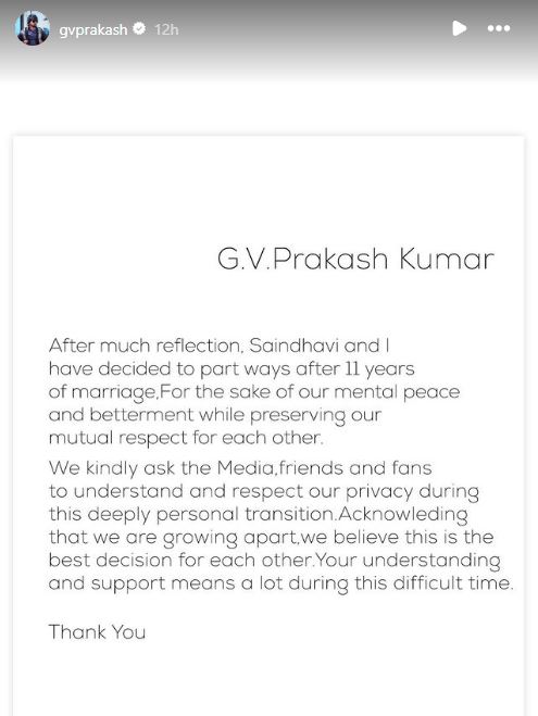 ಜಿವಿ ಪ್ರಕಾಶ್ ಕುಮಾರ್ ಹಾಗೂ ಪತ್ನಿ ಸೈಂಧವಿ ಅವರು ದೂರ ಆಗುವ ಬಗ್ಗೆ ಈ ದಂಪತಿ ಸೋಶಿಯಲ್ ಮೀಡಿಯಾದಲ್ಲಿ ತಿಳಿಸಿದ್ದಾರೆ. ಈ ವಿಷಯ ಕೇಳಿ ಅಭಿಮಾನಿಗಳಿಗೆ ಬೇಸರ ಮೂಡಿಸದೆ.