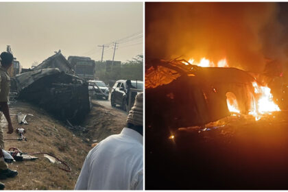 ಕಂಟೇನರ್ ಲಾರಿ ಡಿಕ್ಕಿ ಹೊಡೆದು ಹೊತ್ತಿ ಉರಿದ ಖಾಸಗಿ ಬಸ್, 9ಕ್ಕೂ ಹೆಚ್ಚು ಮಂದಿ ಸಜೀವ ದಹನ