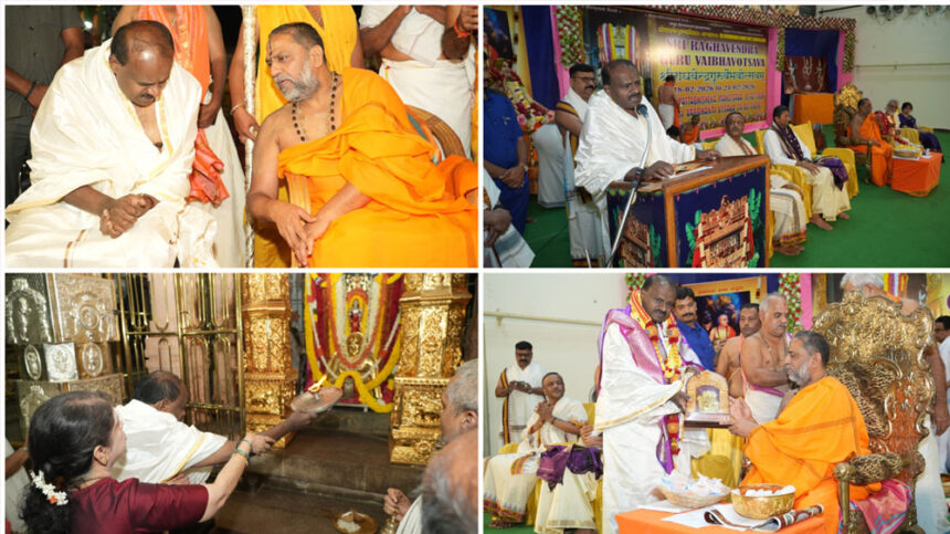 ಮಂತ್ರಾಲಯ: ಮಂತ್ರಾಲಯ ಕ್ಷೇತ್ರದ ಶ್ರೀ ಗುರು ರಾಘವೇಂದ್ರ ಸ್ವಾಮಿಗಳ ಸನ್ನಿಧಿಯಲ್ಲಿ ಭಾನುವಾರ ಭಕ್ತಿಭಾವದಿಂದ ನಡೆದ ಶ್ರೀ ಗುರುರಾಯರ ವೈಭವೋತ್ಸವದಲ್ಲಿ ಕೇಂದ್ರ ಸಚಿವ ಎಚ್.ಡಿ. ಕುಮಾರಸ್ವಾಮಿ ಅವರು ಕುಟುಂಬ ಸಮೇತವಾಗಿ ಭಾಗವಹಿಸಿದರು.